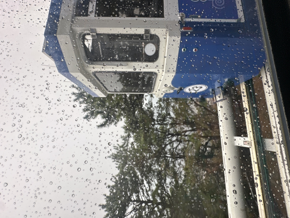 The image captures an exterior scene viewed through a window heavily speckled with raindrops, indicating active precipitation or recent rain. The primary subject is a blue and white monorail capsule, partially visible on the right side, featuring multiple windows and a circular emblem displaying the number "23." This monorail unit is positioned on an elevated, white tubular track, consistent with the Sky Capsule system of the Haeundae Blueline Park in Busan, South Korea. In the background, a dense cluster of evergreen trees, likely pines, stands under an overcast sky. No individuals or specific actions are discernible within the frame.