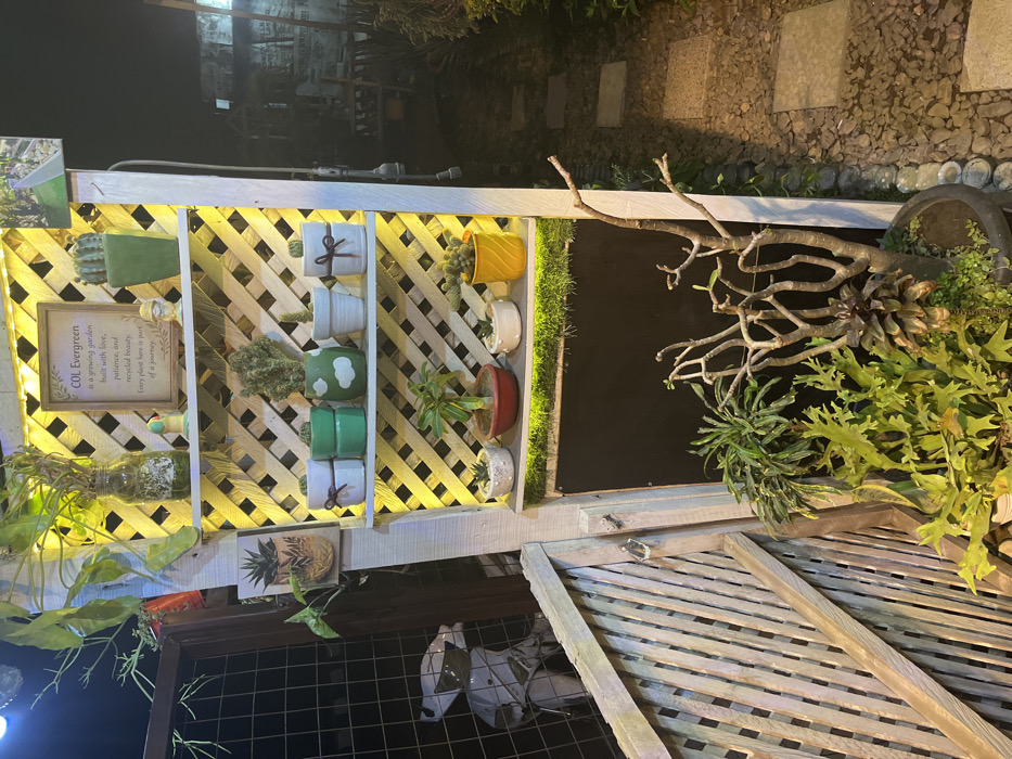 A white lattice shelf displays potted plants and a framed sign reading "COL Evergreen is a growing garden built with love, patience, and recycled beauty