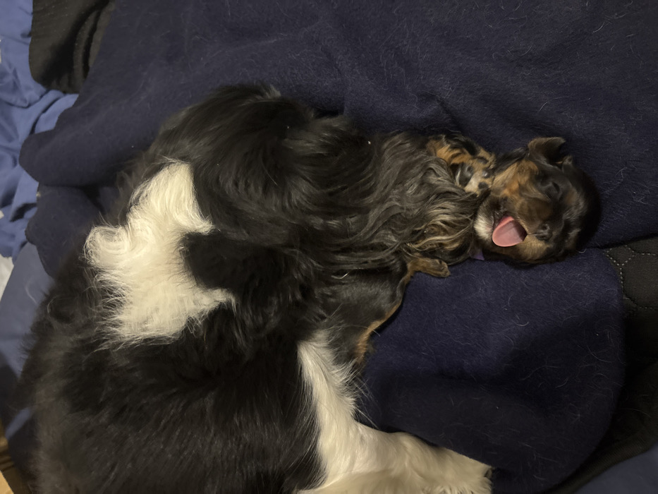 - "A black and white Cavalier King Charles Spaniel is sleeping on a dark blue blanket" by FM-jgPhH3, licensed under CC BY 4.0