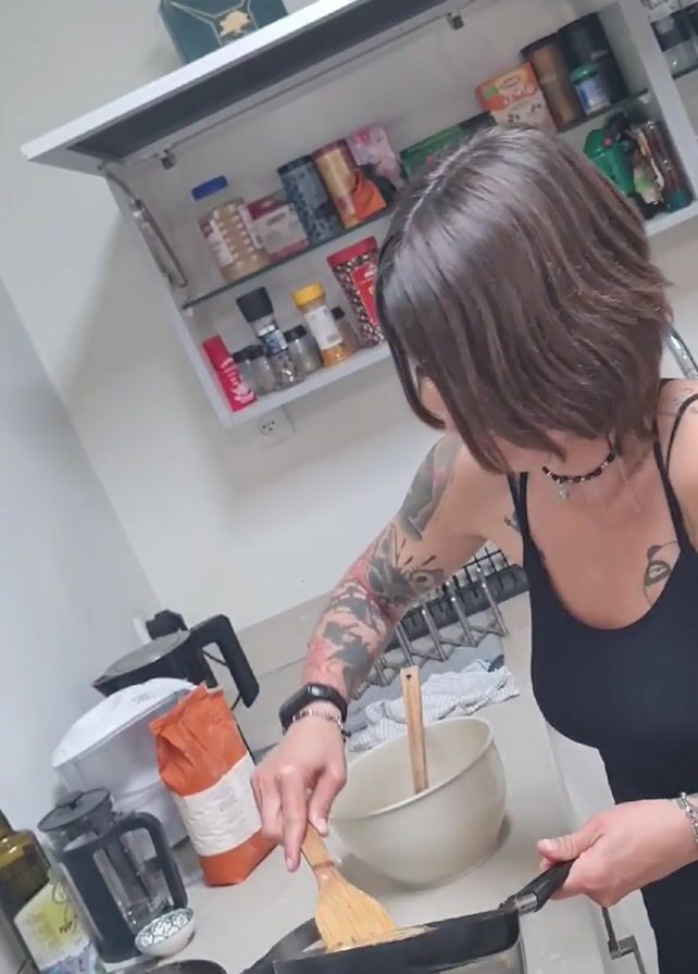 A woman is cooking in a kitchen. She is fair-skinned with short brown hair and visible tattoos on her arm. She is wearing a black tank top and a beaded necklace. She is standing in front of a gas stove with two frying pans on it. She is using a wooden spatula to flip a pancake in one of the pans. There is a white bowl with batter next to the stove, along with a bag of flour, a blender, and a bottle of olive oil. Above her is a white cabinet filled with food items and containers. The woman smiles briefly and appears to be enjoying cooking while listening to music.