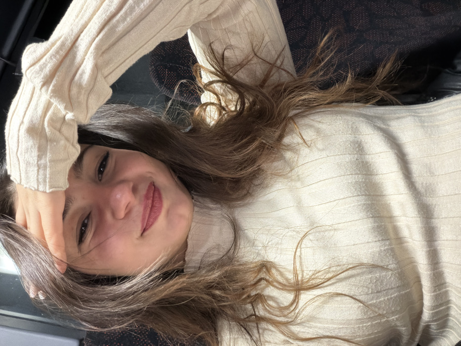 A young woman lies on her back, angled to the camera. She has long, brown hair that curls around her face. Her skin is fair, and she wears a light-colored turtleneck sweater. She is smiling slightly, and her left hand is resting on her forehead. The background is dark, with hints of fabric and possibly a window. The overall impression is casual and relaxed.
