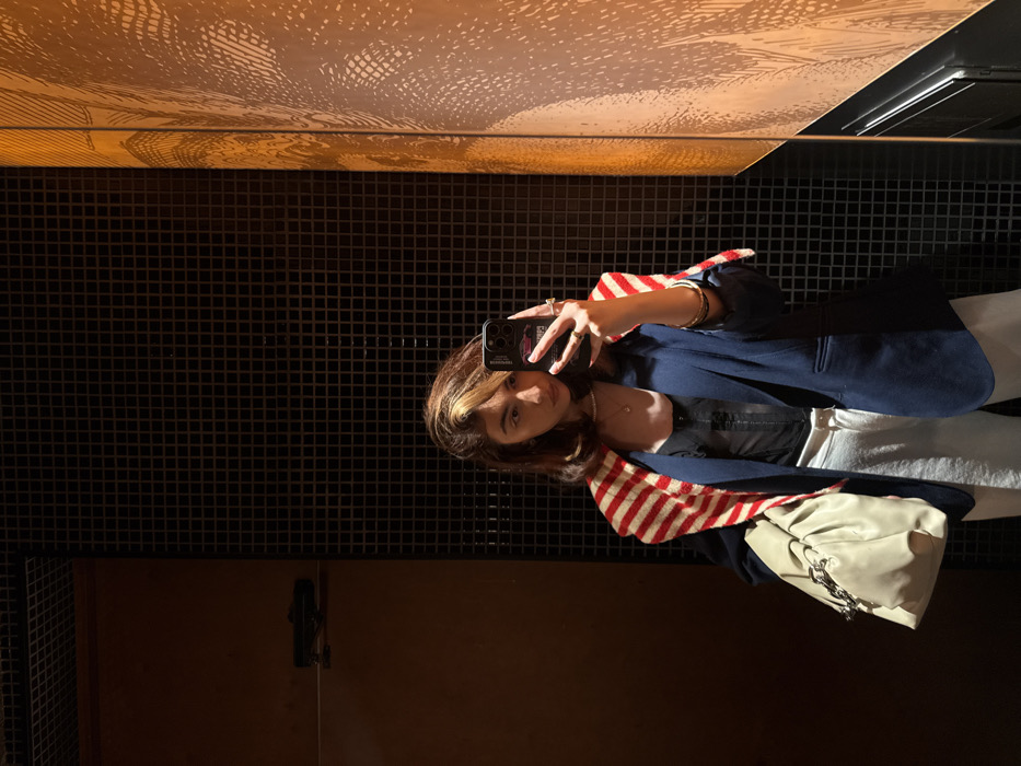 A female subject is depicted in a mirror selfie, holding a dark-colored smartphone with a sticker on its case in her right hand, capturing her reflection. She has medium-length brown hair with lighter highlights, a pearl necklace, and multiple rings. Her attire consists of a navy blue blazer, a black corset-style top, light-colored trousers, and a red and white striped knit shawl draped over her shoulders. She carries a light beige or cream-colored soft leather handbag with a silver chain accent on her left arm. The background, visible in the mirror's reflection, features a dark, grid-patterned wall to the right and a warm-toned, brownish-orange wall section with an intricate, possibly organic or feather-like design to the left, which is illuminated. The scene is an interior space, likely within a commercial establishment, located in Yerevan, Armenia.
