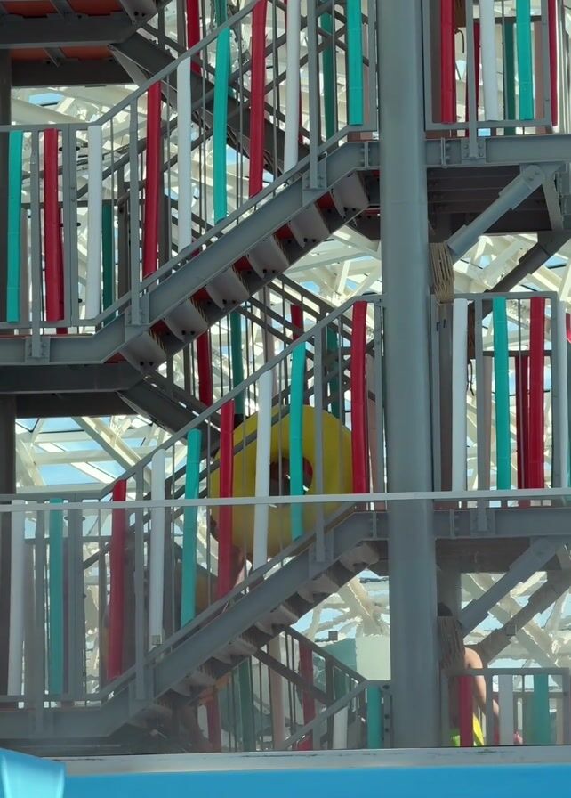 multi-level metal structure with a staircase adorned with vertical slats in red, teal, and white. People are seen carrying yellow inflatable tubes up the stairs, likely to access a water slide or other water park attraction. A blue pool is visible at the bottom of the frame, suggesting that the structure is part of a water park or cruise ship water area. The overall design is modern and colorful.