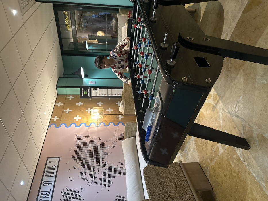 The image captures a modern lounge or recreational area in Serris, France, featuring a young male child engaging with a foosball table