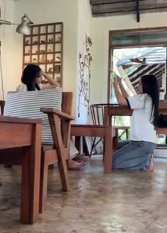 In a well-lit, rustic-looking indoor setting, two young women are interacting. One woman, with long dark hair and dressed in a white t-shirt and light blue jeans, is kneeling on the floor, using her phone to take a picture of the other woman. The woman being photographed is sitting in a wooden chair with a striped cushion. She also has long dark hair and is wearing a light-colored top. The furniture in the room is primarily made of dark wood. In the background, there's a grid-like display case with small objects inside, and a wall decoration featuring thin wires. Natural light floods the room through a window and open doorway. The floor is a light, speckled stone. The overall atmosphere seems relaxed and casual.