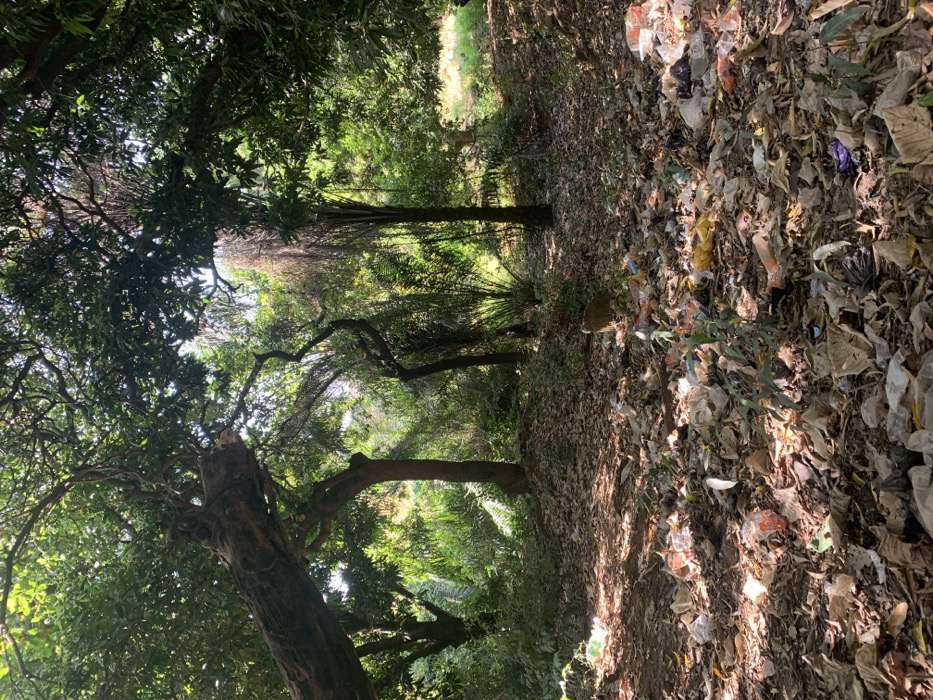 The image displays a heavily vegetated outdoor scene in Tataura, Nigeria. The foreground and midground are characterized by an extensive accumulation of refuse, consisting primarily of various plastic bags (white, clear, yellow, black, purple), plastic bottles, and unidentifiable debris, intermingled with fallen leaves and natural ground cover. Multiple trees with dense green canopies dominate the upper and central portions of the frame, creating a dappled lighting effect on the ground where sunlight penetrates. A prominent tree with a thick, leaning trunk is visible in the left-center foreground. Other trees, including those with slender trunks and palm-like foliage, form a dense backdrop, suggesting a wooded or overgrown area. The ground surface appears uneven, with a slight upward incline towards the background. In the middle-right section of the frame, near a small mound of earth or debris, a small, light-colored animal, possibly a rodent or fowl, is discernible amidst the trash. No human subjects, direct actions, or interactions are visible within the scene.