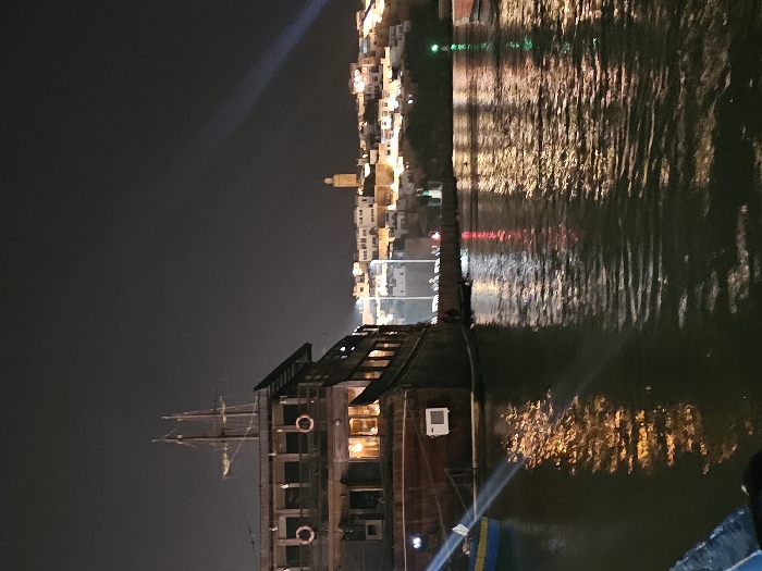 This image captures a nighttime scene along the Bou Regreg River in Rabat, Morocco, likely viewed from the Rabat side looking towards the illuminated city of Salé. In the left foreground, a large, multi-decked wooden vessel resembling a historical ship replica is moored. The vessel's dark hull features lower deck windows emitting warm orange light, and two white circular lifebuoys are visible on the upper deck railing. Two bare masts with rigging extend towards the dark sky. The river's dark surface reflects various artificial lights from the vessel and the far bank, creating shimmering patterns of orange, red, and green, with discernible ripples. The opposite bank features a densely built urban landscape, identified as Salé, illuminated by numerous warm, yellow lights. A prominent, tall, square minaret with a pointed cap rises above the city skyline. A horizontal band of brighter white lights stretches across the mid-section of the distant city, possibly a bridge or waterfront promenade. The dark night sky shows a distinct diagonal beam of white light traversing its upper right quadrant, originating from an unseen source beyond the city, with additional vertical light beams projecting from the city itself. A fragment of a smaller blue and yellow boat is visible in the extreme lower-left corner. No individuals are discernible within the frame.