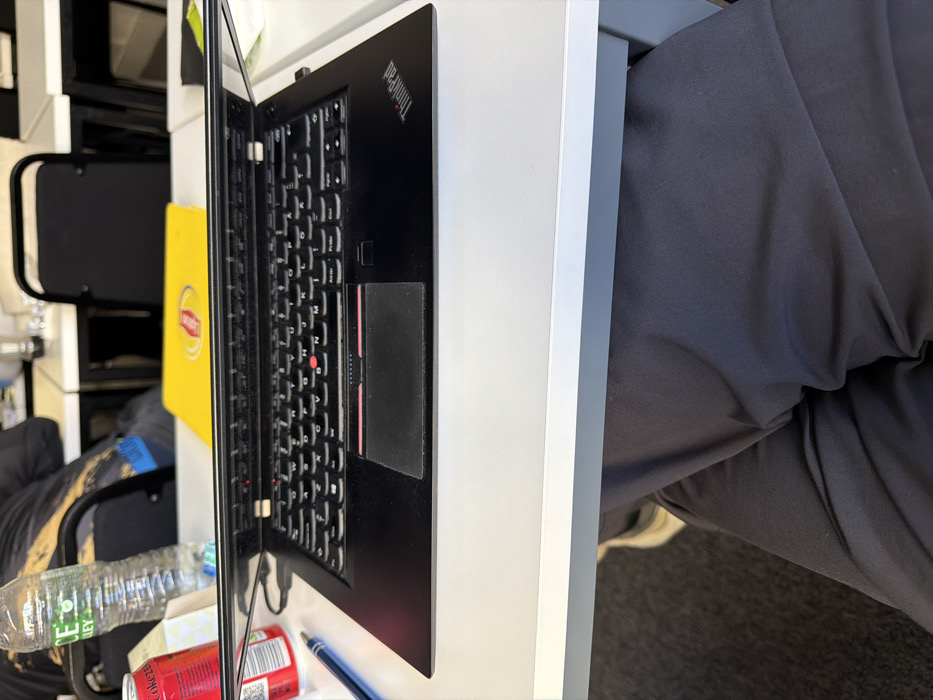 The image depicts an indoor scene from a seated, first-person perspective, likely within a classroom, training room, or conference facility in Manchester, United Kingdom. The precise location within Manchester is not identifiable from the visual information. In the foreground, the lower legs of an individual, wearing dark trousers and a light-colored shoe, are visible beneath a light grey desk. Centrally on this desk, a black Lenovo ThinkPad laptop is open, displaying its keyboard, trackpad, and red TrackPoint; a black cable is connected to its left side. To the left of the laptop, a red Coca-Cola Zero can, a clear plastic water bottle with a green label displaying "VALLEY", and a blue pen are present. In the midground, a yellow rectangular object bearing a red Lipton logo is visible behind the laptop. The background features several light grey tables with black metal frames, arranged in rows, accompanied by black chairs. One individual is partially visible from the back, seated at a table further into the room, wearing dark clothing with lighter patterns. The floor is covered with dark grey carpet. The scene suggests an active work or study environment.