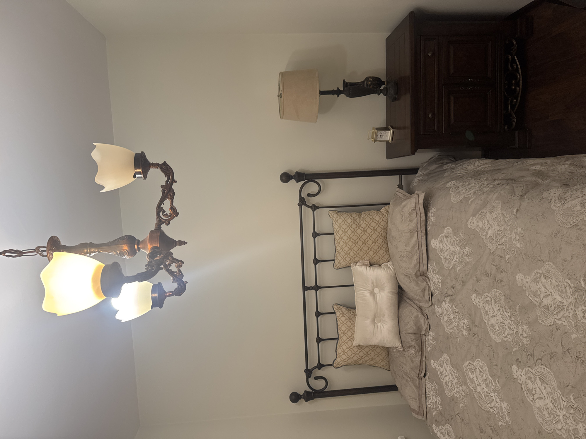 This image depicts the interior of a bedroom located in Vidin, Bulgaria. The scene is illuminated by artificial light sources. In the center of the frame, a bed with a dark, wrought-iron style metal headboard is positioned against a plain, light-colored wall. The bed features a light taupe or beige comforter with a large, white, damask-like patterned design. Two standard pillows, also covered in the same patterned fabric, are visible beneath two decorative square pillows with a repeating geometric quatrefoil pattern in a similar light beige and white. Centered in front of these is a single rectangular, light beige velvet-textured throw pillow with two prominent button tufts. The bed is neatly made. To the right of the bed, a dark wooden nightstand with a single drawer and a two-door cabinet below stands on a dark wood floor. The nightstand features ornate carvings on its base and subtle hardware on the drawer and cabinet doors. On the surface of the nightstand, a classical-style table lamp with a dark base and a light beige fabric shade is present. To the left of the lamp, a small, brass-colored mantel clock with a white face is visible. Above the bed and nightstand, suspended from the ceiling, is an ornate three-light chandelier. The fixture is made of dark, possibly bronze-toned metal with decorative scrollwork. Each light fixture has an inverted, scalloped-edge, frosted glass shade, all of which are illuminated. The walls are painted a uniform light, possibly off-white or very light beige color. The floor beneath the nightstand and extending towards the bottom right of the frame is a dark-stained wood. No individuals are present in the scene.