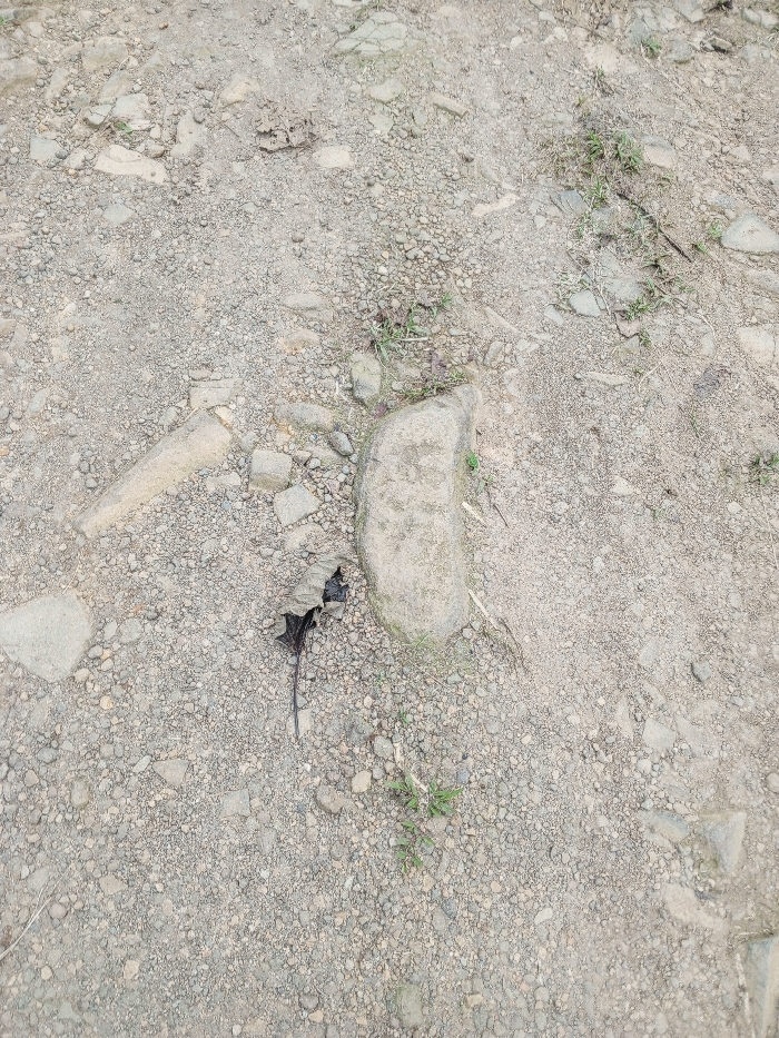 The scene depicts a dry, unpaved ground surface in Thotagamuwa, Sri Lanka, viewed from directly above. The substrate is composed of light greyish-brown soil, densely mixed with various sizes of gravel and irregular, light-colored stones. A prominent, elongated, crescent-shaped, light grey stone, approximately foot-long, is partially embedded in the earth in the lower-right quadrant. To its immediate left, a single dark, desiccated leaf with a visible stem is present. Scattered clusters of green grass and small weeds emerge from the stony soil, primarily in the upper-right and central-right portions of the frame. No human figures, animals, or active interactions are observed within the frame.