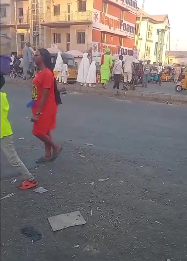 n outdoor urban scene in what appears to be a busy marketplace. A young boy, wearing a bright yellow shirt and grey pants, is carrying a blue bucket on his head as he walks across a street with a woman in a short red dress. They are walking away from the camera, in the same direction. The street is paved with dark asphalt, and there's some litter scattered about. In the background, there's a tall building with the name "HappiFoam" prominently displayed on its side. There are also many other people walking around in the background, some in traditional clothing. There's a yellow tricycle (a three-wheeled taxi) parked near the crowd. The lighting indicates it could be early morning or late afternoon.