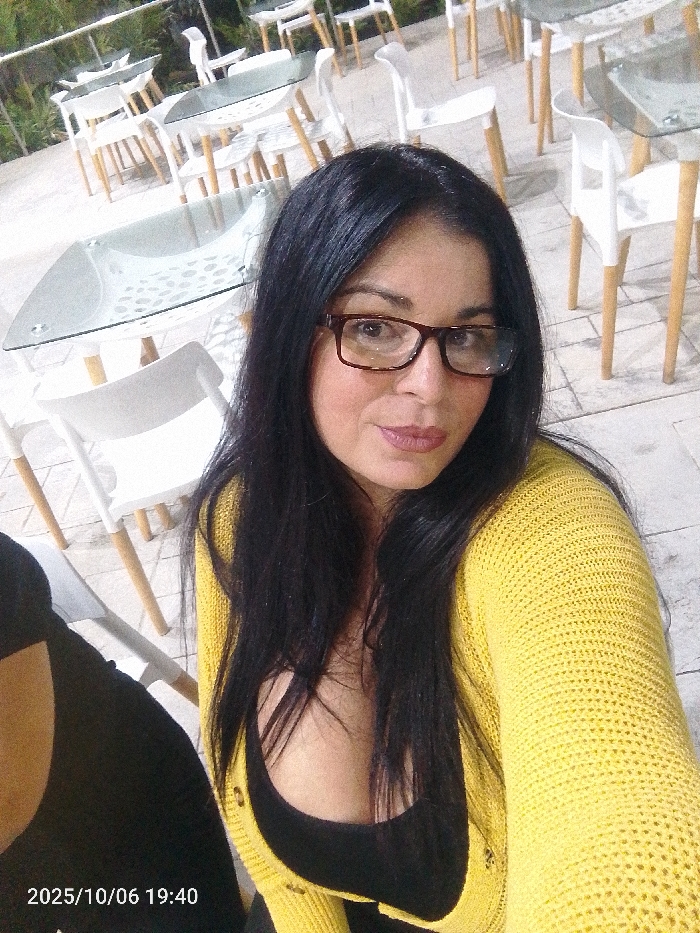 A woman with long, dark hair and brown-rimmed eyeglasses is depicted from the chest up, facing the camera directly, in what appears to be an outdoor dining establishment in Juan Griego, Venezuela. She wears a yellow knitted cardigan over a black top, revealing décolletage. A partial view of another individual in black attire is visible in the lower-left foreground. The background features multiple unoccupied tables with glass tops and distinctive white, irregularly shaped bases, surrounded by white chairs with wooden legs. The ground is paved with light-colored tiles. Artificial lighting suggests an evening setting, aligning with the timestamp "2025/10/06 19:40" displayed in the lower-left corner.