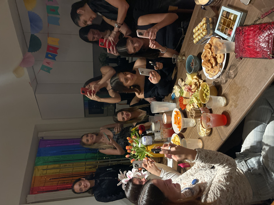A group of women gather around a table filled with snacks, including a charcuterie board, pastries, and carrots, at a party with "Happy Birthday" banners and a rainbow curtain. Several women are holding phones, seemingly taking pictures of the spread. The scene is indoors, and a mix of casual and more formal attire is evident.