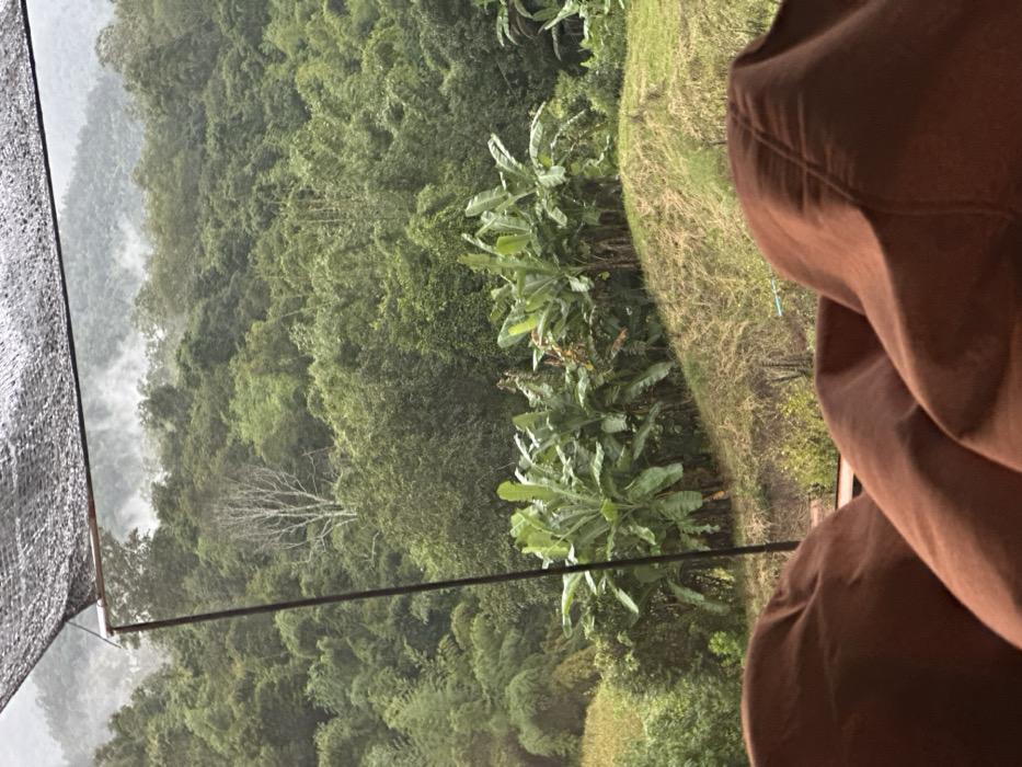 The scene displays a panoramic view of a mountainous jungle landscape in Ban Paem Bok, Thailand, observed from an elevated position. In the immediate foreground, two large, irregularly shaped brown fabric objects, resembling beanbags or cushions, partially obscure the bottom of the frame. Above these, a sloping grassy area with patches of dried vegetation transitions into a cultivated section featuring a prominent row of green banana trees with broad leaves. Further left, an area of lighter green crops is visible. A dark, coarse mesh canopy, likely a shade net, is partially visible in the upper left corner, supported by a thin, dark vertical metal pole that extends into the mid-ground. The background is dominated by dense, multi-layered tropical forest covering a series of rolling hills and mountains. A distinct, leafless tree with light-colored bark stands out against the verdant foliage in the upper-left background. The distant mountain peaks are partially obscured by atmospheric mist or low-lying clouds, indicating a humid environment. No human subjects or discernible actions are depicted within the frame.