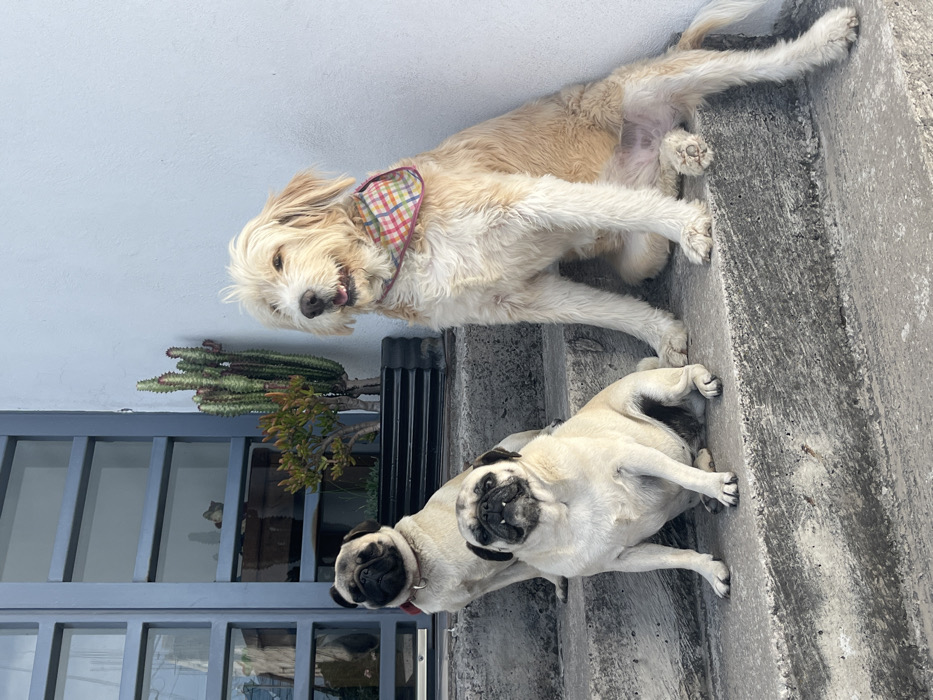 Two dogs rest on stone steps. One is a tan-colored, medium-sized dog wearing a plaid bandana. The other two are light-colored pugs. The tan dog lies near the top of the steps. The pugs are on a lower step. A potted cactus plant sits next to a window with a blue frame.