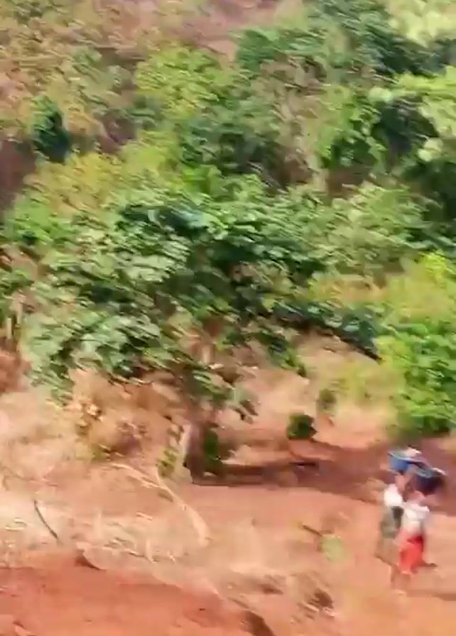 two individuals walking up a hill on a dirt path. They are carrying what appear to be large buckets or containers on their heads. The path is surrounded by trees and dry vegetation. The ground is red and appears to be made of dirt or clay.