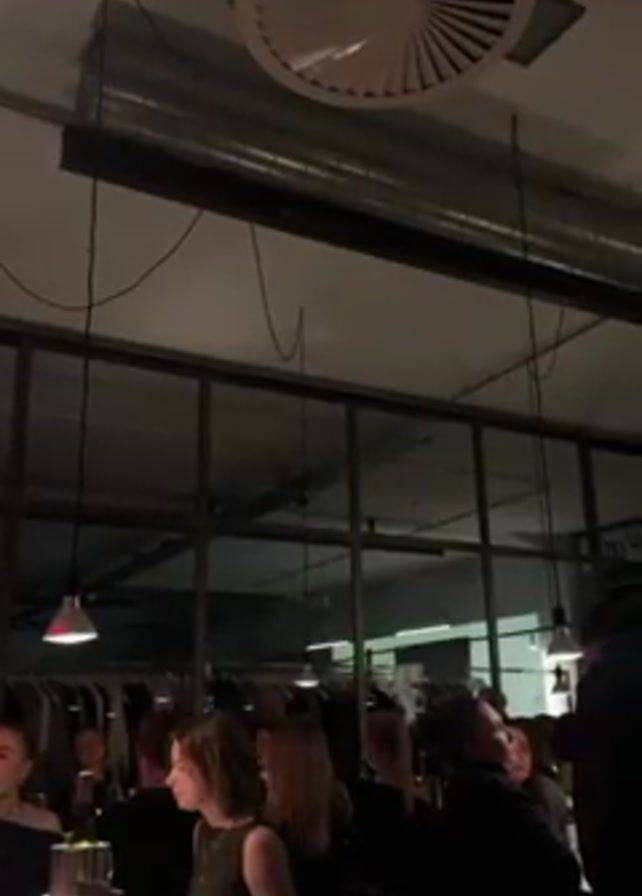 dimly lit, crowded interior space, possibly a bar or clothing store. Several people are standing and sitting, mostly in dark clothing, engaged in conversations. Some are holding drinks. In the background, there are racks of clothing and a large window. Overhead, a circular ventilation fan is visible, along with exposed pipes and wires. The lighting is provided by several small hanging lamps.