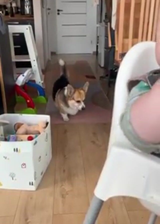 corgi dog walking towards a baby in a high chair