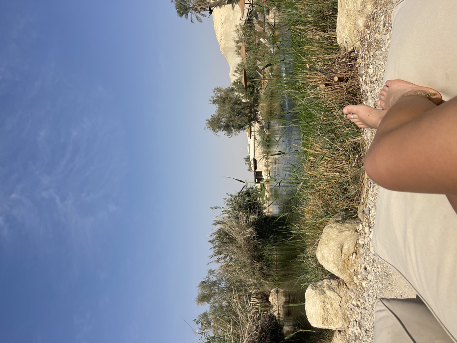 The image displays a first-person, downward-angle perspective of an outdoor leisure area situated within the Arava Tichona Regional Council, Israel. In the immediate foreground, the lower legs and bare feet of an individual are visible, resting on a light-colored, cushioned lounge surface. The individual's skin appears tanned; an anklet is present on the right ankle, and a silver-colored ring is visible on the second toe of the right foot. Beyond the lounge, a transitional zone of light-colored rocks and gravel precedes the edge of a still body of water, likely a pond or small lake, which occupies the mid-ground. The water's surface reflects the blue sky and features a visible fountain creating ripples near its center. The banks of the water body are densely covered with tall, green reeds and various other types of lush, green vegetation, including some taller trees. Across the water, on the opposing bank, multiple low-rise, light-colored buildings with flat roofs are partially visible amongst the greenery. Several tan, parasol-style shade umbrellas are positioned near these structures, indicating outdoor seating. A prominent date palm tree stands on the far right side of the distant bank. The background features a large, light-colored desert hill or mountain. The sky above is clear and bright blue, with minimal, wispy white clouds. The scene is illuminated by strong, direct sunlight, consistent with a sunny day in an arid environment.