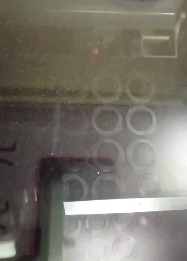 interior of a 3D printer in operation. The printer is printing a set of circular objects on a black printing bed. The build plate has the name "ELEGOO" in the bottom left corner, and below that the text "Optimized for PLA Printing | 230C +/- 25C/80mm/s | Heated bed 30C/C | PLA Specific Plate | Adhesion". The printer's nozzle is visible as it moves across the print bed, depositing material to create the circular shapes. The interior of the printer is enclosed with a clear cover, partially obscured by dust and reflections. In the background, unintelligible audio is present.