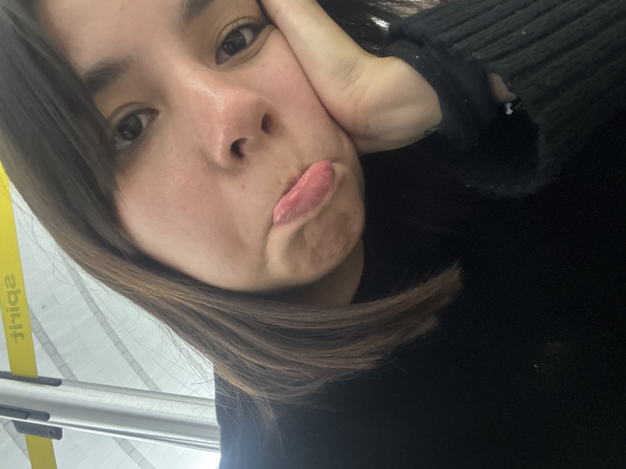 The image presents a close-up, angled portrait of a young individual with brown hair, wearing a black long-sleeved garment. The subject is depicted with a pouting expression, lips extended forward, and the left hand is positioned supporting the left side of the face, resting against the chin area. The background features a light-colored, possibly white or off-white, interior ceiling or wall structure. A yellow horizontal banner with the inverted word "Spirit" printed in black is visible in the upper left portion of the frame, alongside a vertical silver-colored structural pole. The presence of the "Spirit" airline branding within an airport-like environment indicates the scene is located at San Antonio International Airport (SAT) in San Antonio, United States of America.