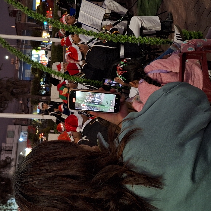 A group of people wearing red Santa hats and dark uniforms are seated outdoors, likely a musical band performing, as seen from the perspective of a woman with brown hair. The woman is recording the performance on her phone, capturing the band's image on the screen. To the right, a young girl with a festive headband also records the scene on her own phone. They are positioned closely together, possibly family members enjoying the performance.