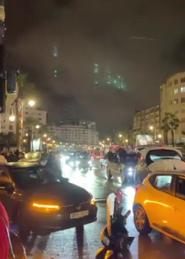 The video depicts a nighttime street scene with traffic and pedestrians. The street is wet, reflecting the lights of cars and streetlamps. There are numerous cars and scooters moving through the intersection, with their headlights illuminating the scene. People can be seen walking on the sidewalks and crossing the street. Buildings line both sides of the street, with streetlights and palm trees adding to the urban ambiance. In the background, faint green lights are visible in the sky. The overall atmosphere suggests a busy urban environment at night.