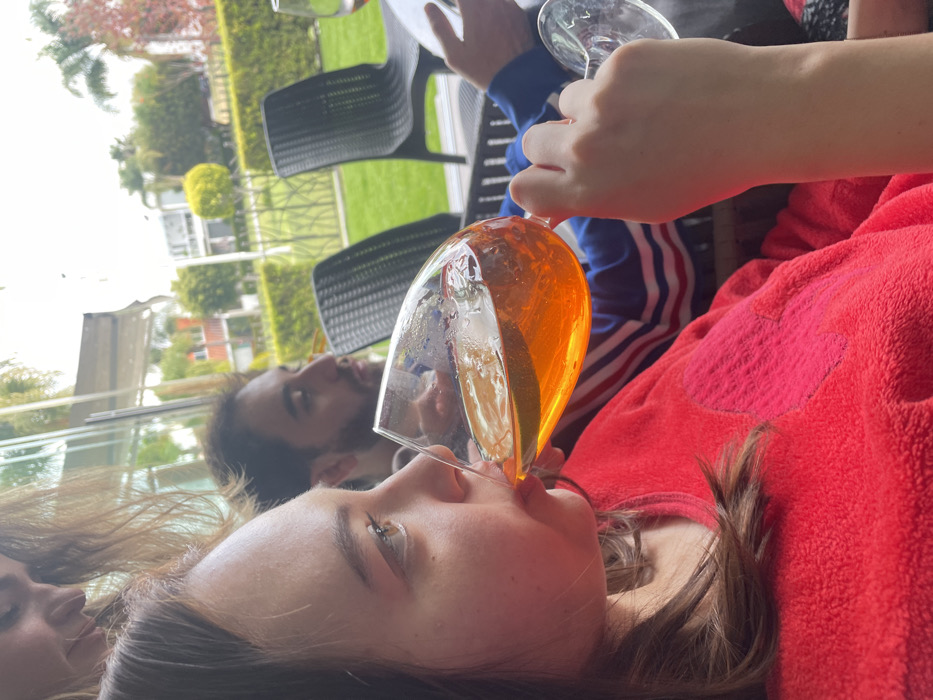 A group sits outside, a young woman drinking from a wine glass filled with an orange beverage and a slice of citrus. Another person holds the glass. Behind her, a bearded man looks on. The setting is outdoors on a sunny day, with green trees and a building visible in the background. Black wicker chairs are partially visible. The group appears to be enjoying drinks together.
