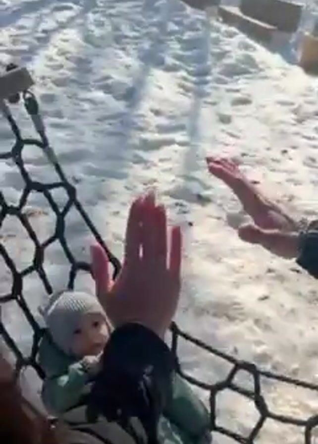 The video begins with a close-up shot of a man in a black jacket and cap, looking at something off-screen in a snowy, wooded area. The scene transitions to a woman with long brown hair standing near a black rope climbing structure in the snow. Lying on the structure is a baby wearing a green snowsuit and a grey knit hat. The woman playfully interacts with the baby by raising her hands, encouraging the baby to give her a high five. The baby smiles and claps its hands together.