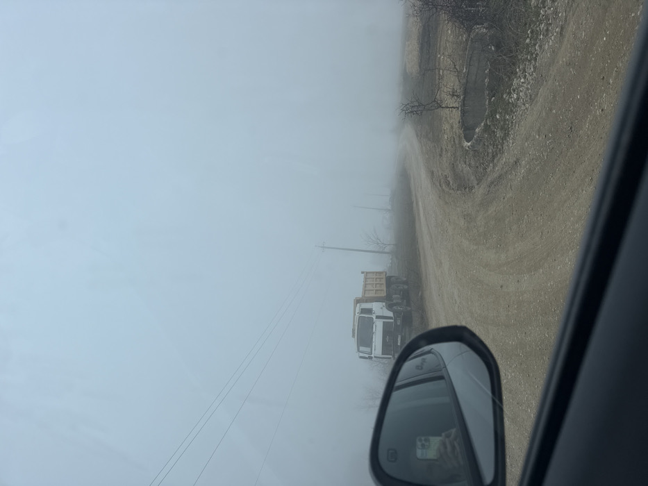 The image depicts a rural scene characterized by dense fog, located in Зеленогорское сельское поселение, Ukraine. The perspective is from the interior of a vehicle, looking out the passenger-side window and into the side mirror. A heavy, uniform light grey fog significantly reduces visibility across the landscape. In the midground, a white dump truck with a light brown bed is stationary on the left side of an unpaved, dirt road. The truck is oriented towards the viewer's vehicle. The dirt road itself, showing visible tire tracks, curves right and recedes into the fog. To the left of the road, multiple wooden utility poles support overhead power lines, which stretch horizontally across the frame before disappearing into the mist. Sparse, leafless trees and shrubs are visible along the roadside and in the surrounding fields, indicative of a dormant season. In the immediate foreground, the dark dashboard and door trim of the viewer's vehicle are visible. The passenger-side mirror prominently reflects a person holding a smartphone, actively capturing the scene. To the right of the dirt road, a partially visible circular concrete structure, resembling a well casing or culvert, is present on the dry, uneven ground. The overall environment is one of limited visibility and a muted, cool color palette.