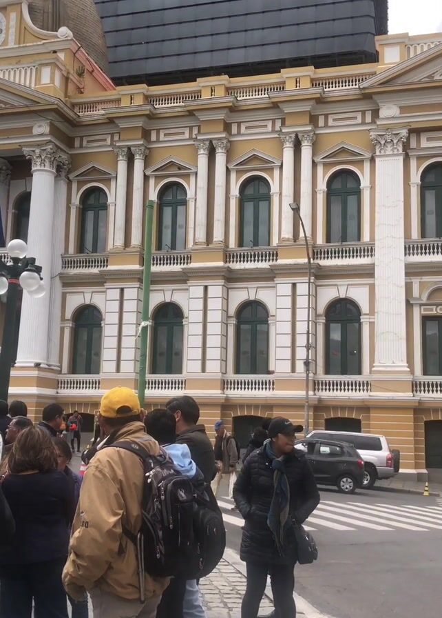 The video depicts a group of people gathered on a sidewalk in front of a grand, multi-story building