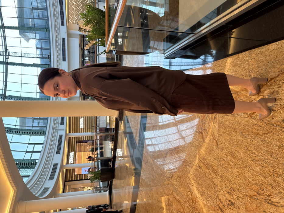 A female subject stands in an indoor, multi-level retail environment within The Dubai Mall in دبي, United Arab Emirates. The subject is positioned facing left, turning her head back over her right shoulder to look directly at the viewer. She has dark hair pulled back and is wearing a long-sleeved brown button-up shirt, a dark brown ribbed midi skirt, and light beige high-heeled pumps. Her right hand is not visible, and her left arm hangs at her side. The environment features a highly polished, light brown and gold-veined marble or granite floor with reflective dark sections. In the background, large, light-colored circular columns are visible. The upper levels of the structure curve, featuring white railings and large glass panels that form part of the ceiling or a skylight, revealing glimpses of external building structures or sky. Several luxury retail stores are present on the ground and upper levels, including a prominent "ZEGNA" storefront with illuminated signage and mannequins, and a partial "CHANEL" sign below it. A glass railing with a light wooden top separates the subject from a display containing green foliage and white flowers to her right. Reflections of the ceiling structure and light sources are prominent on the highly polished floor and glass surfaces.