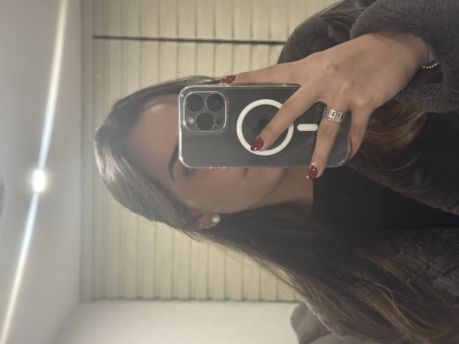 A woman is taking a mirror selfie with her iPhone. The phone has a clear case with a MagSafe ring. She is wearing a gray furry jacket and a ring with roman numerals. Her nails are painted burgundy and she has a small pearl earring in. The background is a set of vertical blinds. The image is rotated counter-clockwise.