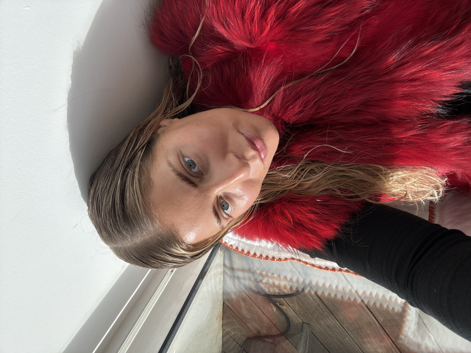 The image presents a close-up, high-angle view of an adult female located indoors in Rousset, France. The subject has light blonde hair, parted in the center and appearing wet or slicked. Her eyes are light blue, and her complexion is tanned, with direct light illuminating her face from the upper left, casting a defined shadow onto the white wall behind her head. She is wearing a vibrant red faux fur vest over a black long-sleeved top. To the left side of the frame, a white and orange patterned textile is partially visible on a surface resembling wooden flooring, possibly viewed through a reflective or transparent barrier, alongside a dark cable. The background is dominated by a plain white wall.