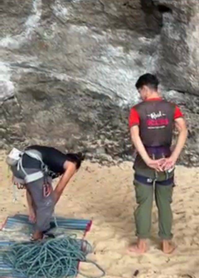 Two barefoot individuals stand on sand next to a cave-like rock formation. The person on the left wears a dark shirt, gray pants, and a climbing harness. They are bent over, seemingly adjusting their shoes while standing on a blue and gray striped mat. A coiled green rope lies next to the mat. The person on the right wears a maroon and gray shirt, green pants, and a climbing harness. They reach down and pick up the edge of the mat, seemingly moving it.