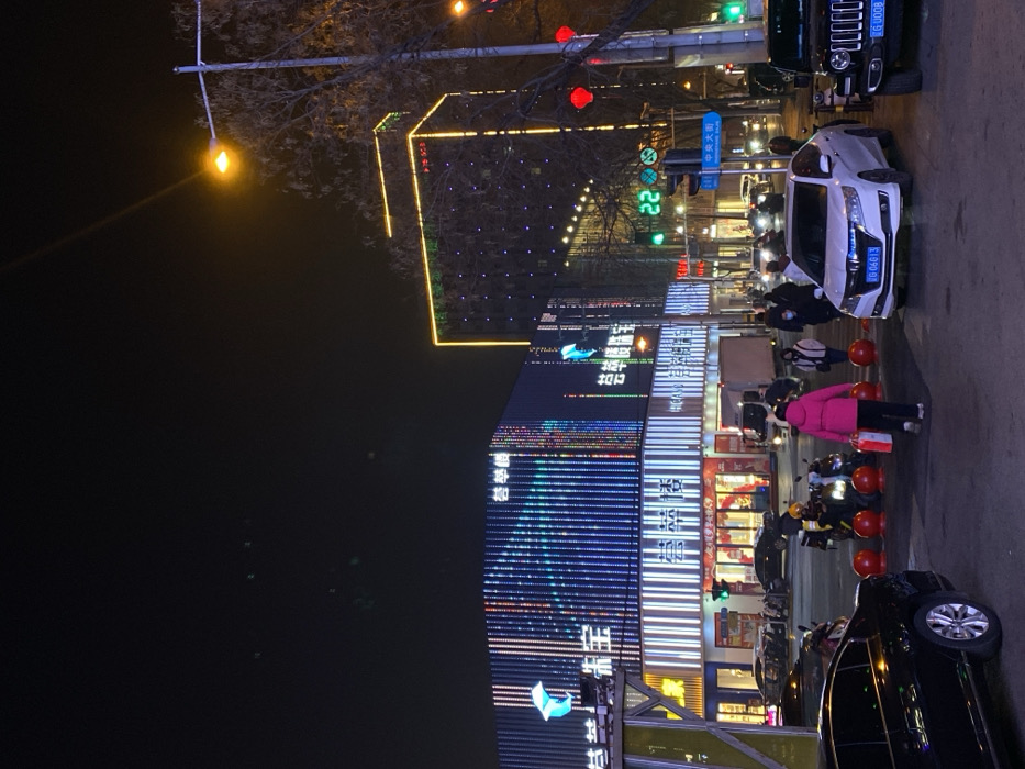 This image captures an urban street scene at night in Linghe, China, characterized by commercial activity and extensive artificial illumination
