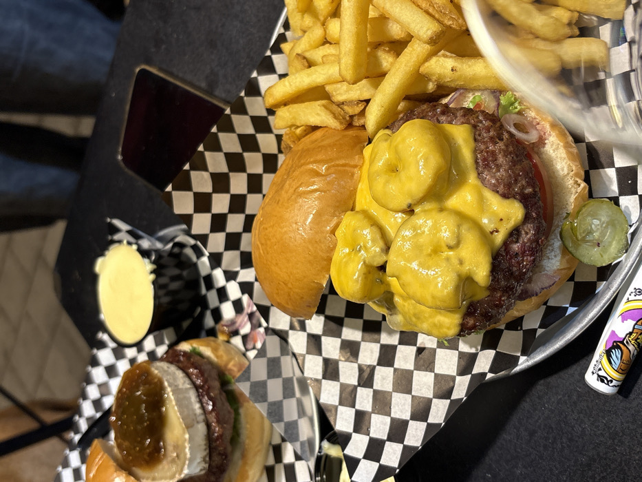 This image, set in Tel-Aviv, Israel, depicts a close-up view of a dark dining table laden with food from a casual establishment. In the foreground, a large hamburger is presented on a metal tray lined with black and white checkered paper. This burger features a thick beef patty topped with melted bright yellow cheese and several sautéed mushrooms, also covered in cheese. Its top bun rests partially removed, while the bottom bun reveals red onion rings and a pickle slice. Alongside this burger is a substantial portion of golden-brown french fries. To the left, a second, smaller hamburger is visible, also on a metal tray with checkered paper. This burger has a beef patty topped with a thick, round slice of white cheese, possibly goat cheese or brie, further adorned with a dollop of a dark, lumpy, brownish-green condiment. Between the two burgers, a small black cup filled with a creamy yellow dipping sauce rests on checkered paper. A dark-colored smartphone, screen-down, is positioned on the table behind the food. In the lower-left corner, a colorful cylindrical object, resembling a vape pen or lighter, is visible next to a metal utensil. A clear glass or cup containing additional french fries is partially visible on the far right. The background is blurred, showing indistinct shapes and a person's legs in jeans, indicating an indoor restaurant or bar environment.