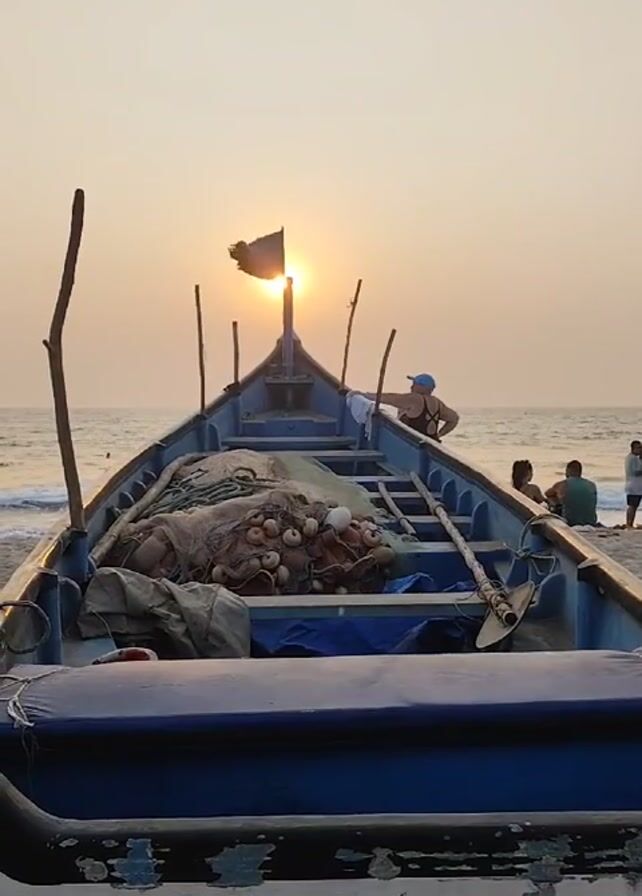 interior of a blue fishing boat on a beach at sunset. The boat is filled with fishing nets and other gear, including paddles and what appears to be a collection of floats. A tattered black flag is mounted on the boat's stern. In the background, the ocean meets the shore, and several people are visible: one person stands near the boat adjusting something on the boat's stern, another is swimming in the sea, and others are sitting or standing on the beach. The sky is a light orange color, with the sun appearing as a bright spot directly behind the boat's flag.