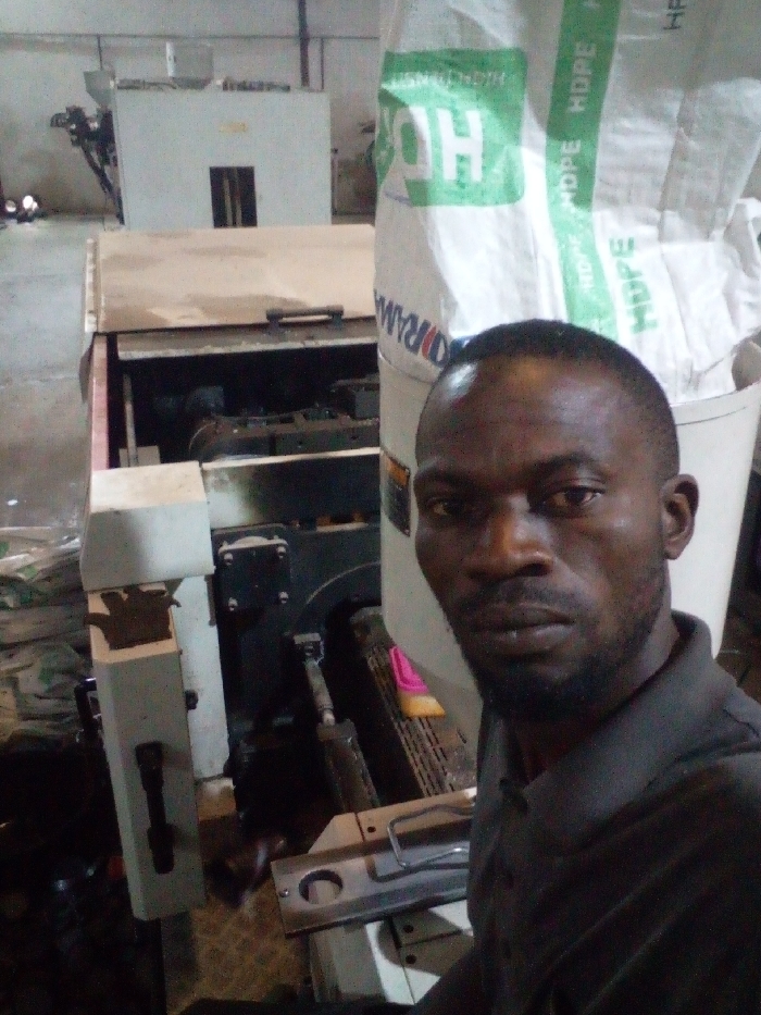 A man stands in what appears to be a manufacturing or industrial setting. He is positioned in front of a large machine, possibly used for production or processing. Next to him is a white bag labeled with "HDPE," a type of plastic. The background includes more industrial equipment and a general workspace environment. The image's lighting suggests an indoor space with artificial illumination.