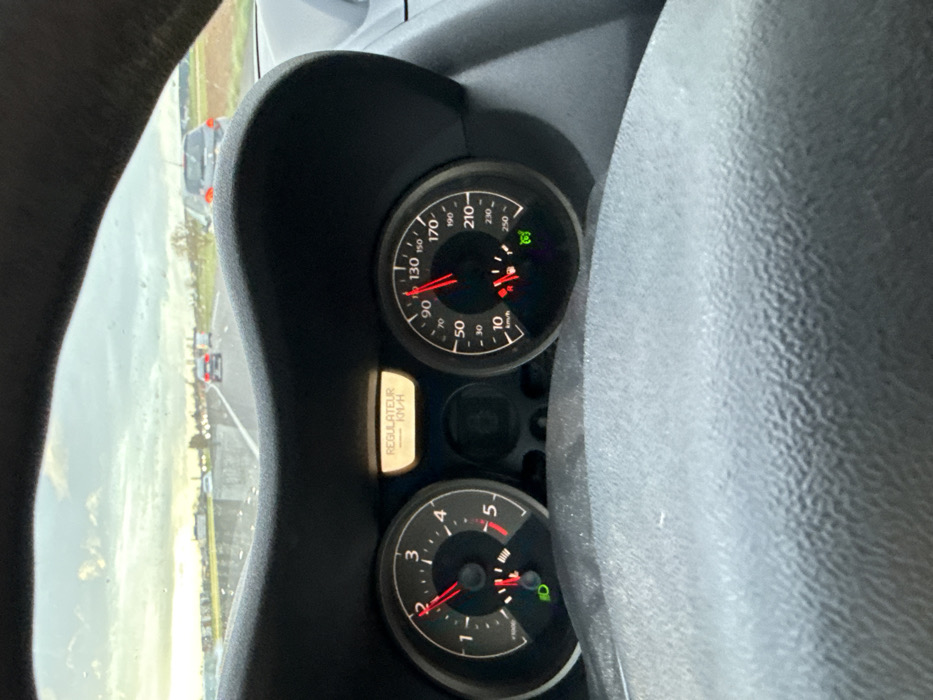 The image depicts a driver's perspective from within a vehicle on a multi-lane highway in Geispolsheim, France, under an overcast sky. The vehicle's dashboard is prominent in the foreground, featuring a steering wheel and instrument cluster. The left dial, a tachometer, indicates approximately 2500 RPM, with a green parking/headlight indicator illuminated below. A central digital display shows "REGULATEUR" (Cruise Control) and "124 KM/H," confirming the vehicle's speed and operational mode. The right dial, a speedometer, corroborates this, with its needle pointing to approximately 124-125 km/h. A red low fuel warning light is illuminated, alongside another green indicator light, possibly for an eco-mode feature. Through the windshield, the road ahead is visible, appearing damp or reflective. Multiple vehicles are observed traveling in the same direction, with a dark-colored hatchback most discernible directly ahead. The surrounding environment consists of flat terrain, some distant trees, and open fields, typical of a highway traversing a rural-urban interface. No individuals are directly visible.