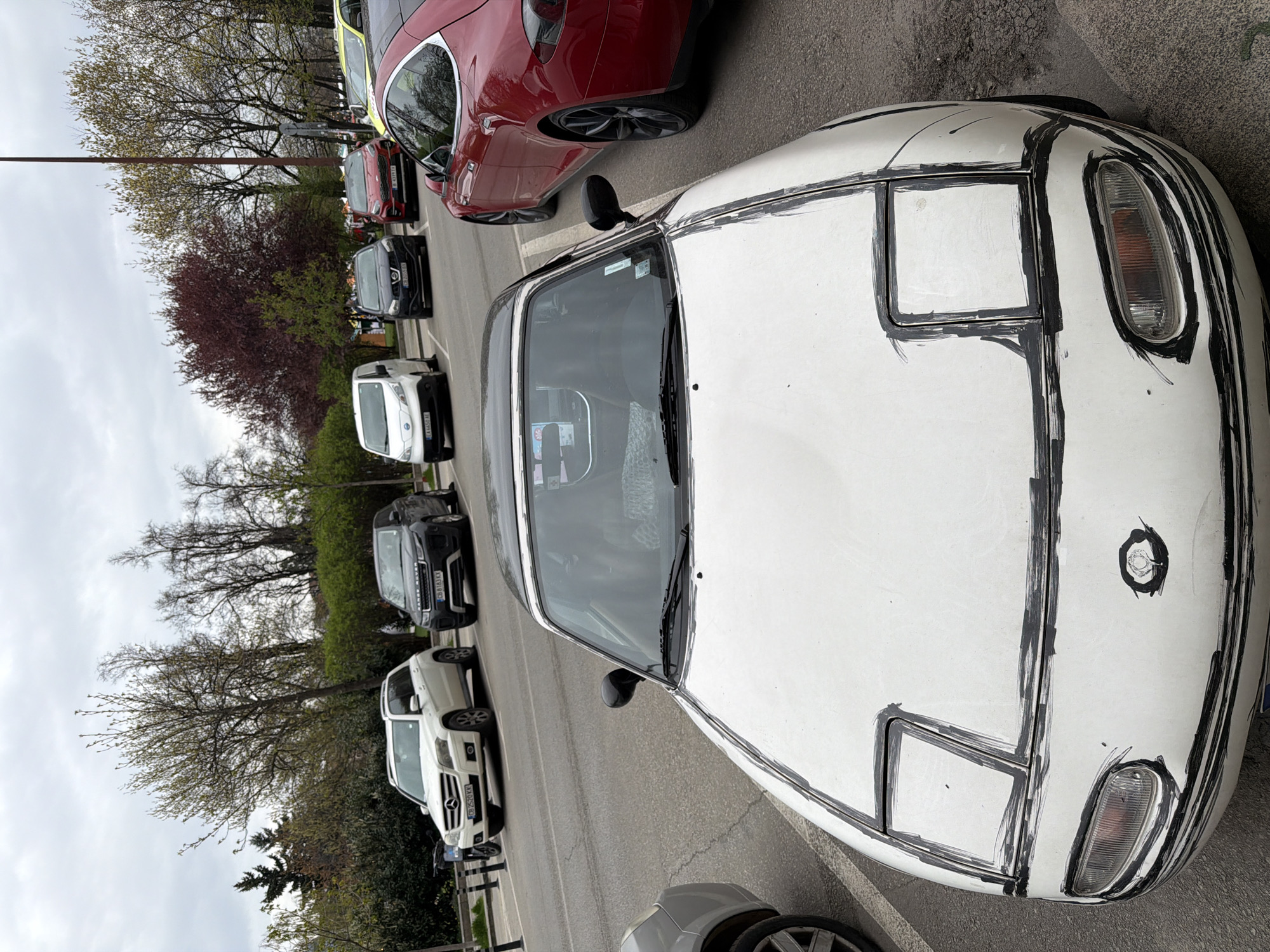 white Mazda Miata with black marker outlines around the headlights and hood, parked in a parking lot in Sofia, Bulgaria. Several other cars are parked nearby, including a red car, a yellow car, and a white van. Trees line the background of the parking lot. The sky is overcast.