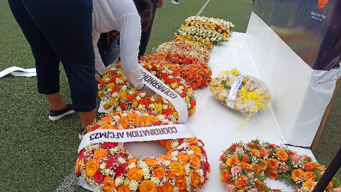 - "The scene depicts a collection of floral wreaths arranged on a white-covered surface, likely a table, situated on a green artificial turf sports field in Rubavu, Rwanda" by FM-qmVie2, licensed under CC BY 4.0