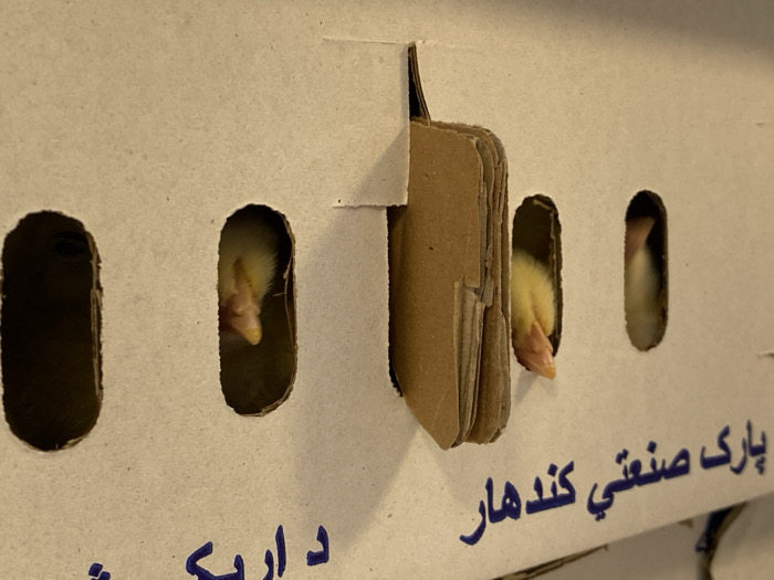 A cardboard box with evenly spaced oval holes reveals glimpses of baby chicks inside. Three holes prominently display the fluffy yellow down and tiny beaks of the chicks. The box has a folded cardboard flap providing structure. The inscription "پارک صنعتی کندهار" is visible in blue lettering on the lower right of the box.