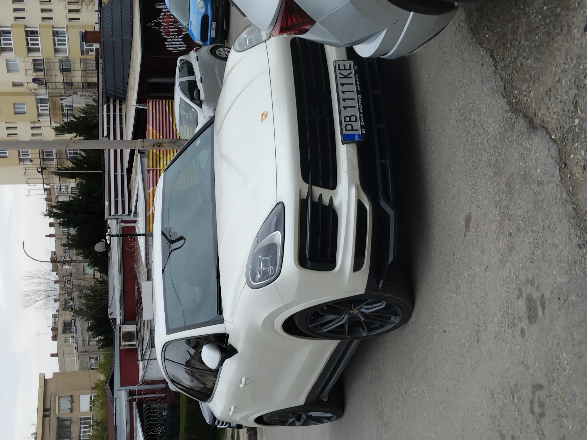 front of a white Porsche Cayenne parked on a street, likely in an urban setting