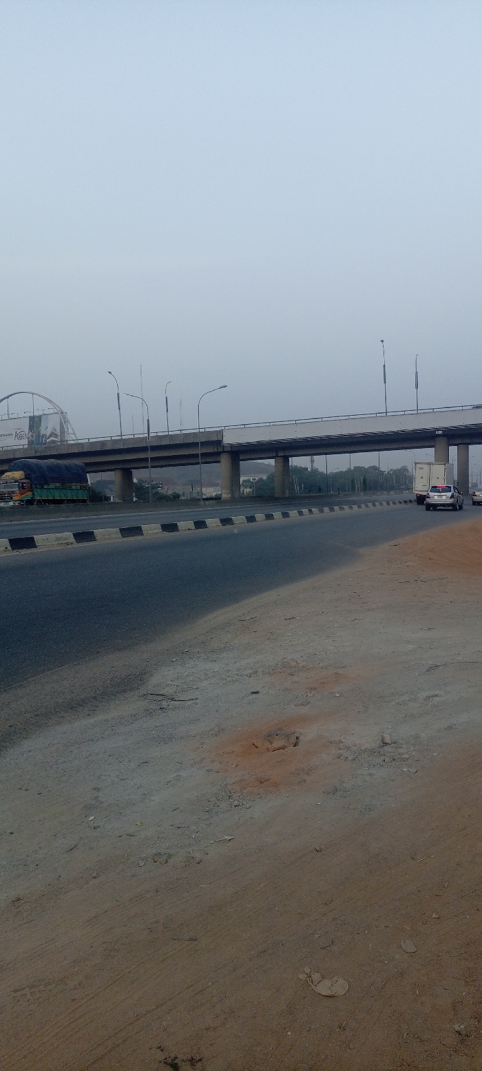 A low-angle view depicts a highway scene under a hazy sky. An overpass spans the width of the scene, supported by concrete pillars. Streetlights line the overpass and the roadside. A few vehicles are visible on the highway, including a truck with a green tarp and a white car. The foreground is dominated by a dirt shoulder, transitioning to the paved road.