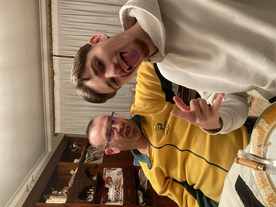 Two men pose indoors; one older wearing glasses and a yellow fleece, flashing a rock-on hand gesture. The other, younger, sports a white hoodie and sticks his tongue out. They are near a table setting with plates and utensils. A bookshelf loaded with books and decorative objects is visible behind them. The room is lit with warm, soft lighting. Curtains hang in the background.