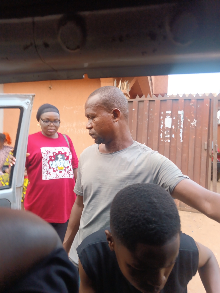 The scene depicts an outdoor urban environment in Orifite, Nigeria, with a light-colored vehicle's open door on the left. A medium-complexioned adult male with short dark hair and a beard, wearing a grey t-shirt, stands in the center-right, head turned slightly left with his mouth partially open. His left arm is extended horizontally to the right. To his left, an adult female with glasses and a black head covering, wearing a red t-shirt with a "CORENOL" graphic, stands near the open vehicle door. In the immediate foreground, the top of a head with short, dark, kinky hair and shoulders of an individual in a dark sleeveless garment are visible, facing downwards. A fourth individual, partially obscured, is visible within the vehicle doorway behind the woman, wearing patterned fabric. The background features a light brown building wall with faded white markings (e.g., "COVEN," "OPH links") and a dark brown metal gate with a serrated top edge. The image is captured from inside a vehicle, with a dark structural beam visible across the top of the frame. The individuals appear to be in a transitional state, potentially entering or exiting the vehicle.