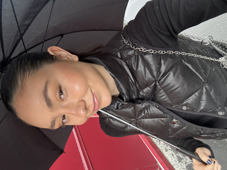 woman standing outdoors. She is holding a black umbrella over her head, and she is wearing a black puffer vest, a black long-sleeved shirt, and a silver chain purse. She has long dark hair that is pulled back in a ponytail. She is smiling and looking towards the camera. She is standing in front of a bright red wall. This location is in Issy-les-Moulineaux, France, at coordinates 48.849 latitude and 2.325 longitude.