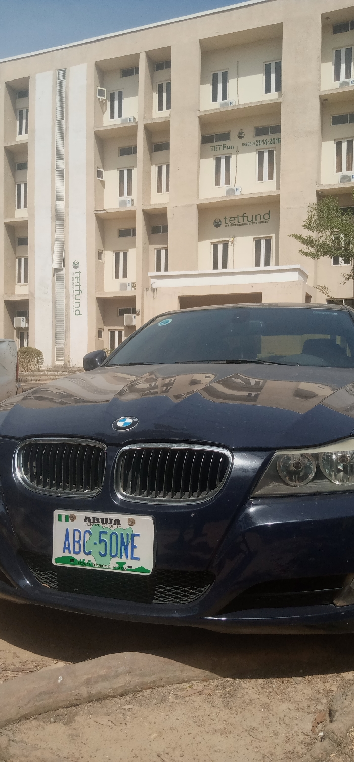 A dark blue BMW sedan is parked on a dirt surface in front of a multi-story, light-colored building under a clear blue sky. The vehicle's front is centrally positioned, displaying a chrome-trimmed kidney grille and the BMW emblem on the hood. The license plate, "ABUJA ABC-50NE," features the Nigerian flag on the left and a green map of Nigeria in the center, with "FEDERAL REPUBLIC OF NIGERIA" text at the bottom. Reflections of the building are visible on the car's hood and windshield. The background building, possibly an institutional structure, has a beige or cream facade with numerous uniformly spaced windows. Several external air conditioning units are mounted below various windows. Multiple "TETFund" logos are visible on the building. A prominent vertical "tetfund" logo runs along a white column on the left side. Another "TETFund" logo is seen above a portico-like structure, with associated text "MERGED 2014-2016" and "2014-2016 ANNUAL INTERVENTION PROJECT" visible on the facade. The ground in the immediate foreground consists of compacted dirt or gravel, with a low concrete curb directly in front of the vehicle. Sparse green foliage is visible to the right of the building. The location is a TETFund-affiliated facility or project site in Kaduna, Nigeria.