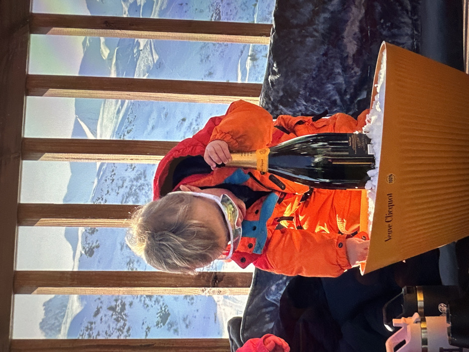 - "A young child, wearing an orange and blue ski suit and white-framed reflective goggles, leans forward over an orange, ribbed Veuve Clicquot branded ice tub" by FM-jTO4l2, licensed under CC BY 4.0